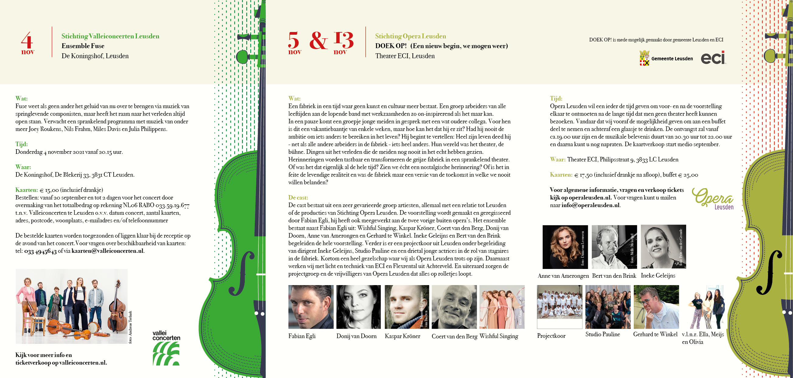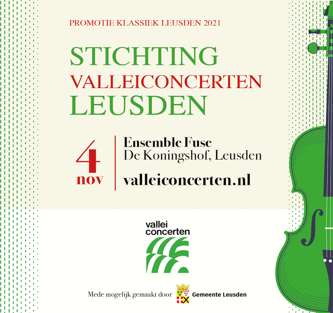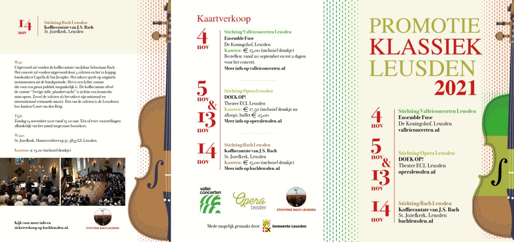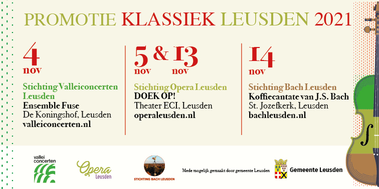 De 3 klassieke organisaties in Leusden bestaande uit Stichting Opera Leusden, Stichting Bach Leusden en Stichting Valleiconcerten Leusden werkten in 2021 met elkaar samen om de klassieke muziek meer op de kaart te zetten. Dat deden ze ieder door een uitvoering te geven op hun eigen gebied. Opera Leusden kwam met de uitvoering DOEK OP!, Stichting Bach Leusden bracht de koffiecantate van J.S. Bach ten gehore en Stichting Valleiconcerten Leusden had het ensemble Fuse kunnen boeken. Aan mij de taak om die 3 organisaties met hun uitvoeringen tot 1 geheel te maken in 1 poster, banner en folder.