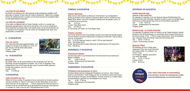 Dit jaar 2022 kwam de Spaanse wielerronde La Vuelta door Leusden. Voor de gemeente een mooie aanleiding om daar iets mee te doen. Er kwam een grote feestweek rondom deze koers en aan mij werd gevraagd om daar iets voor te maken. Onder andere aankondigingsborden en een algemene folder met daarin alle activiteiten.